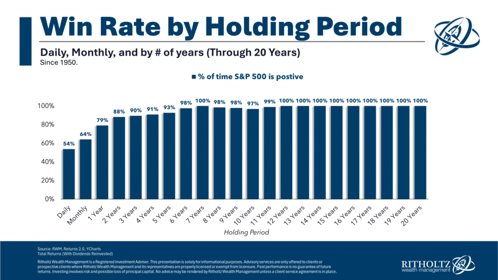 However, as the following chart from Ben Carlson shows, if you lengthen your time horizon your odds of success dramatically increase: