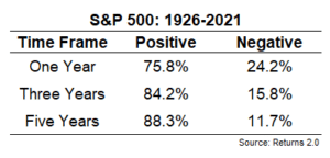 Going back to 1926, here is how often the U.S. stock market was positive over rolling one, three, and five-year periods: