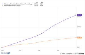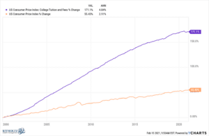 Since the turn of the century, the cost of college in the U.S. has risen at nearly 2.5x the rate of inflation: