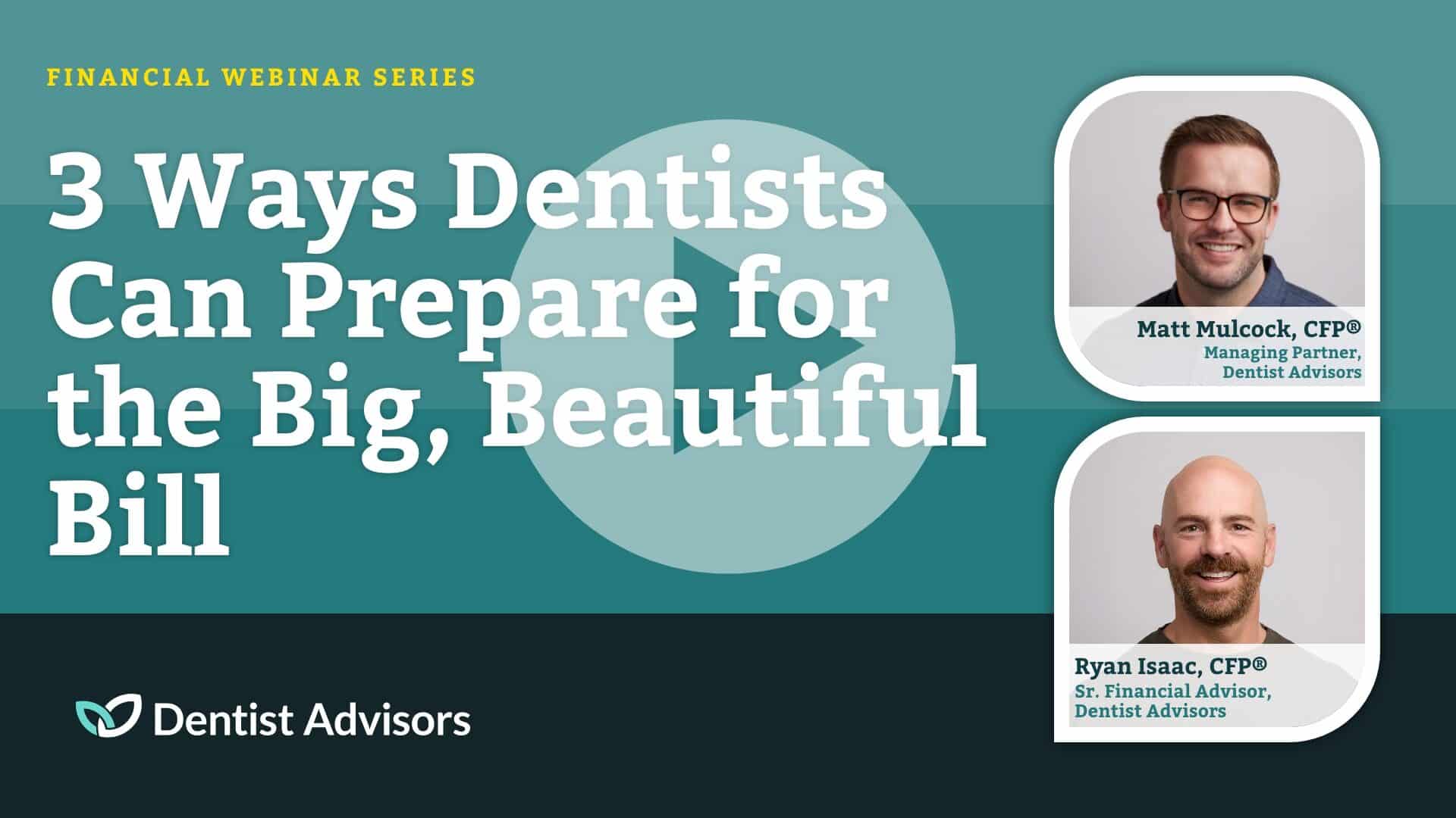 Join Ryan Isaac, CFP® and Matt Mulcock, CFP® from Dentist Advisors as they break down what’s actually in the bill, what’s still uncertain, and what you should be doing today to stay ahead of the changes. They’ll help you make sense of the potential impacts and provide actionable strategies to adjust your financial plan with confidence.