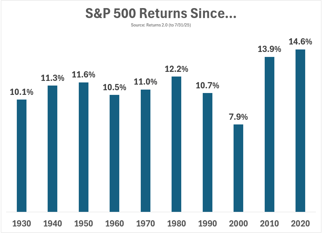 Here’s a chart from Ben Carlson showing S&P 500 returns from the start of each decade until today: