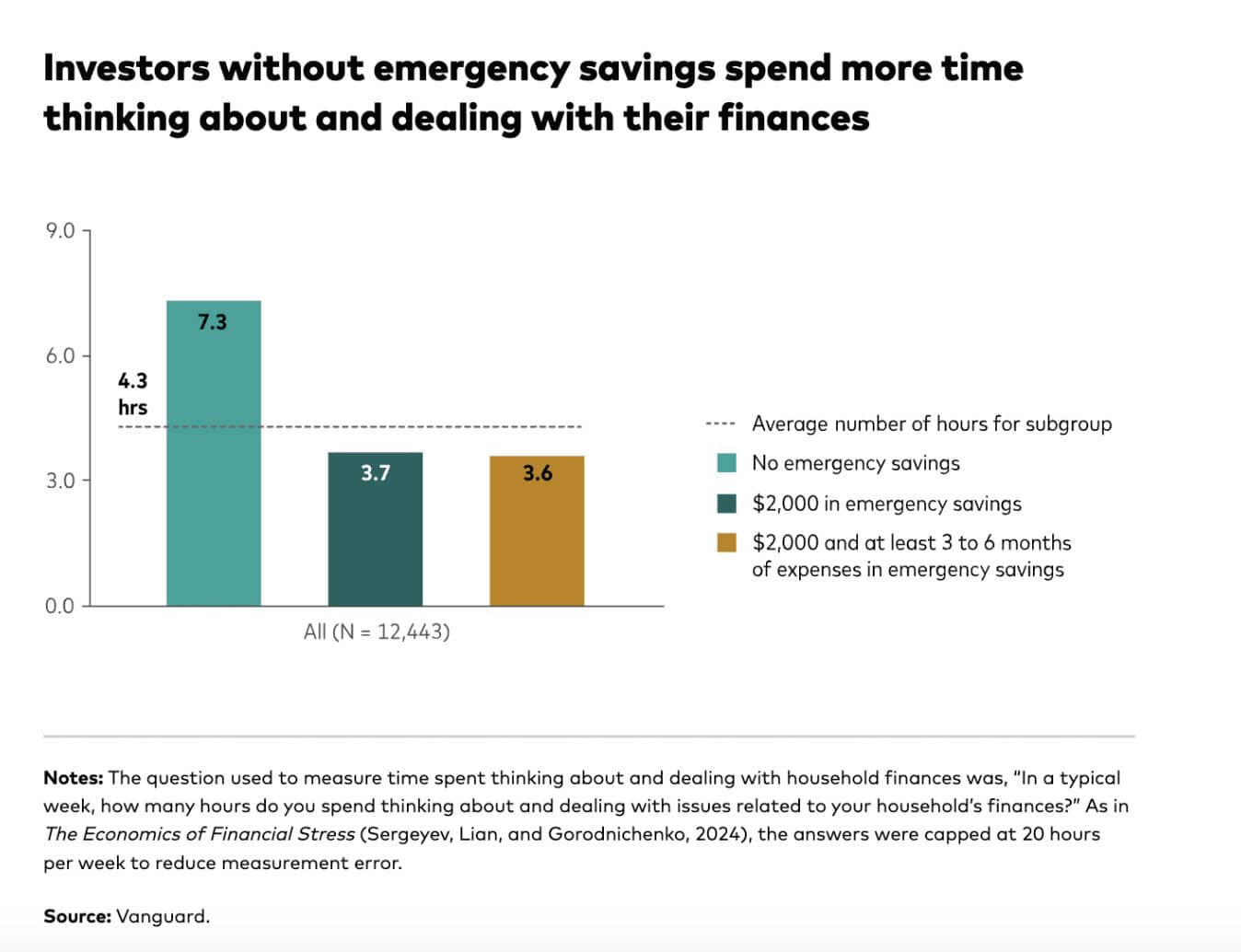 I’ll cite one more recent study from Vanguard, which states that those with at least $2,000 in emergency savings had a 21% higher level of financial well-being compared to those without. Having an additional three to six months of expenses saved offered an additional 13% boost.