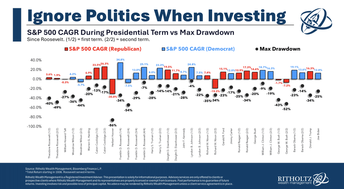You shouldn’t let politics interfere with your investment strategy. Your strategy should be built around your life goals and shouldn’t change based on who’s president.