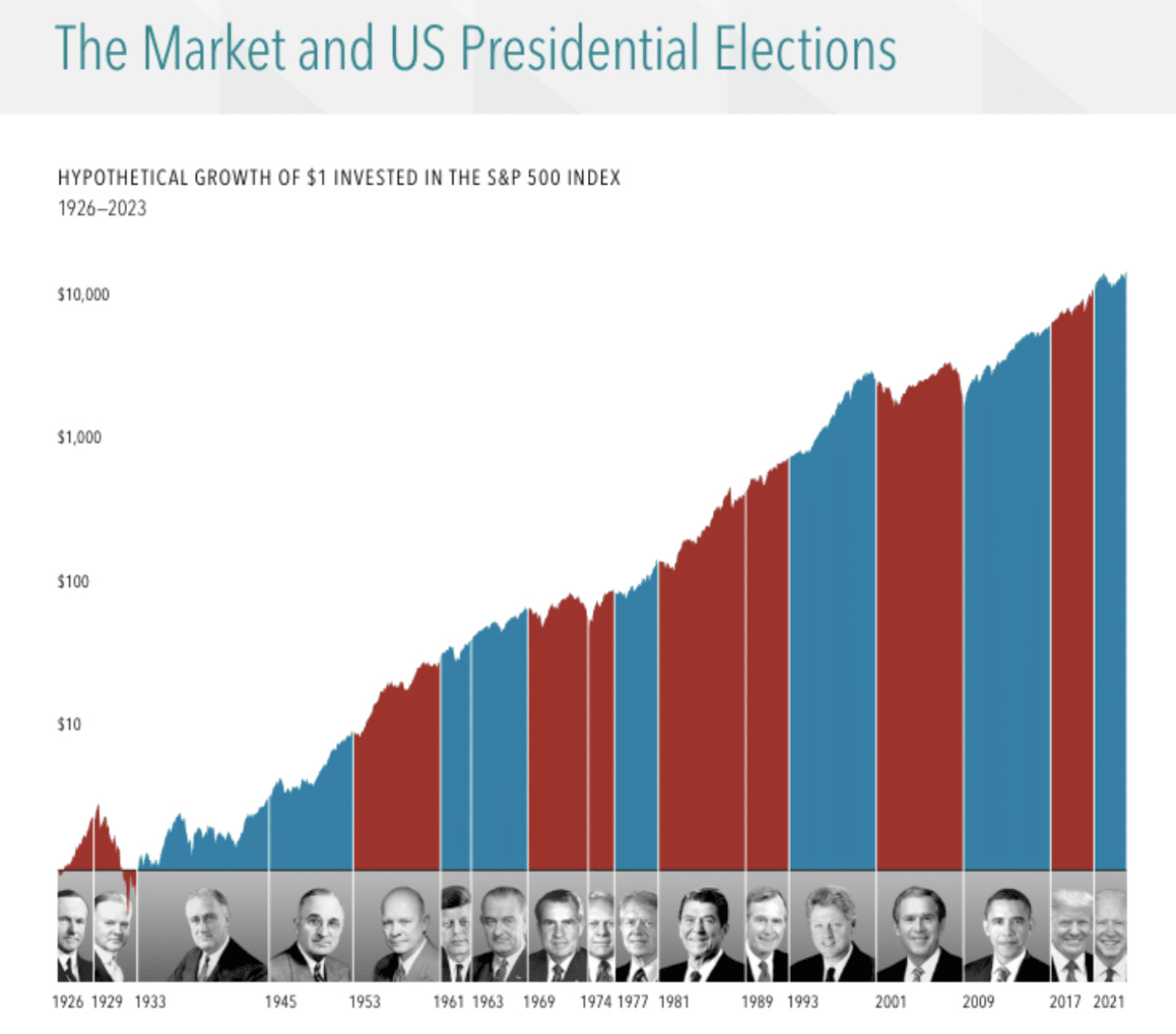 But even with these drawdowns, the stock market has continued to grow, no matter who the president has been: