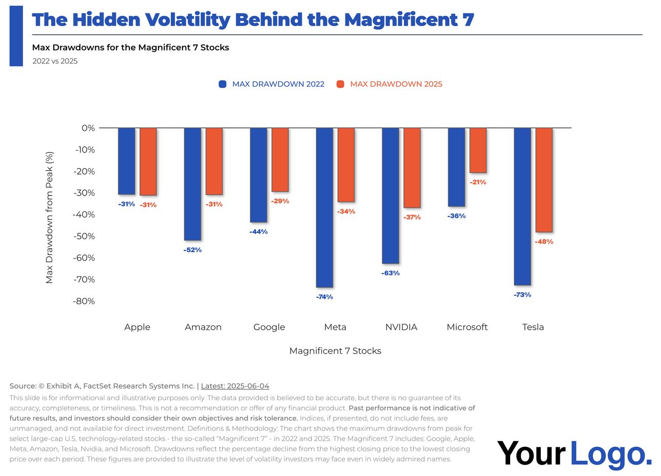 While it’s true these big, popular tech stocks have had great returns in recent years, the experience of holding these stocks hasn’t exactly been easy. The following chart shows the max drawdowns for each of these stocks in 2022 and so far in 2025: