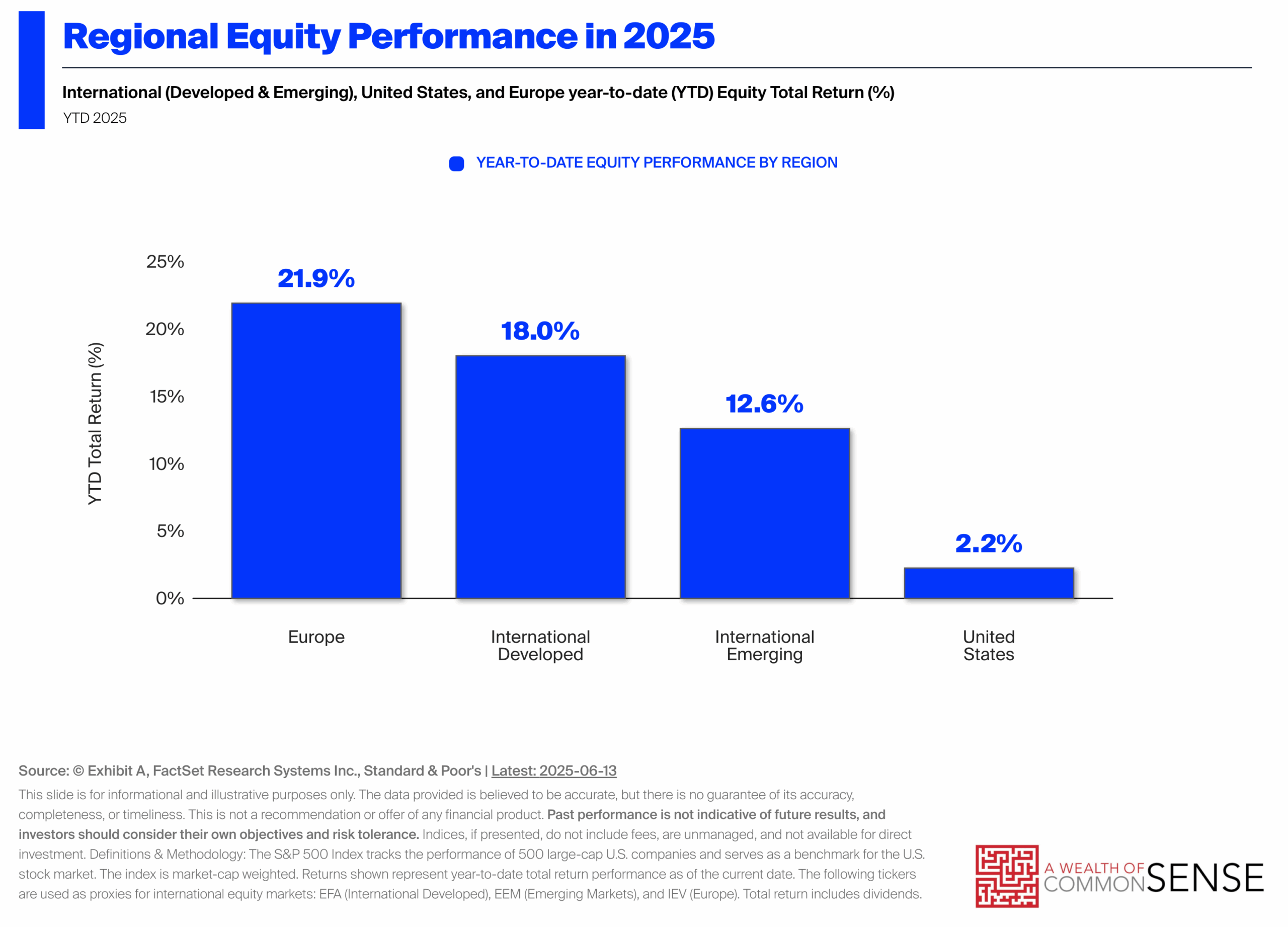 If it seems like U.S. stocks always outperform other countries, that’s recency bias at work. Just because the S&P 500 has done incredibly well over the past decade does not mean that it will continue to do so forever into the future.