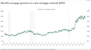 The median monthly mortgage payment on a new mortgage is currently $2,965. The median monthly payment has nearly doubled since the start of 2022 alone: