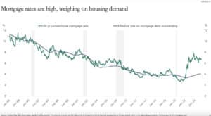 Monthly mortgage costs have skyrocketed due in large part to increased interest rates. The following graph shows the historical 30-year mortgage rate versus the effective rate, which is the rate people are actually paying on their mortgage: