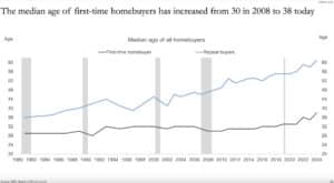 So, because of limited supply and increased demand, house prices continue to go up. This has caused the median age of first-time homebuyers to shoot up from 32 in 2020 to 38 today: