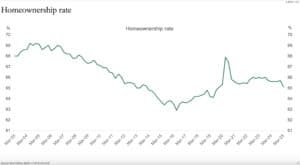 Despite the explosion in housing costs, the national homeownership rate has increased since the mid-2010s and is only down around 3% since the early 2000s: