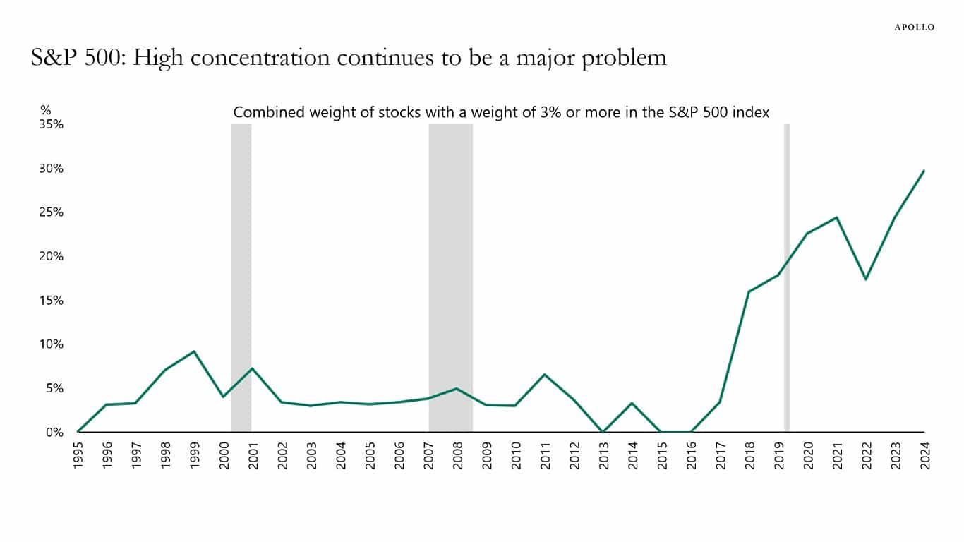 Torsten Slok published a graph that shows the combined weight of stocks with a weight of 3% or more in the S&P 500 index is at an all-time high and continues to rise: