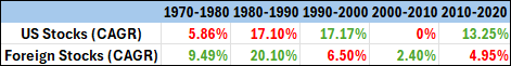 The following chart shows returns for U.S. and foreign stocks by decade: