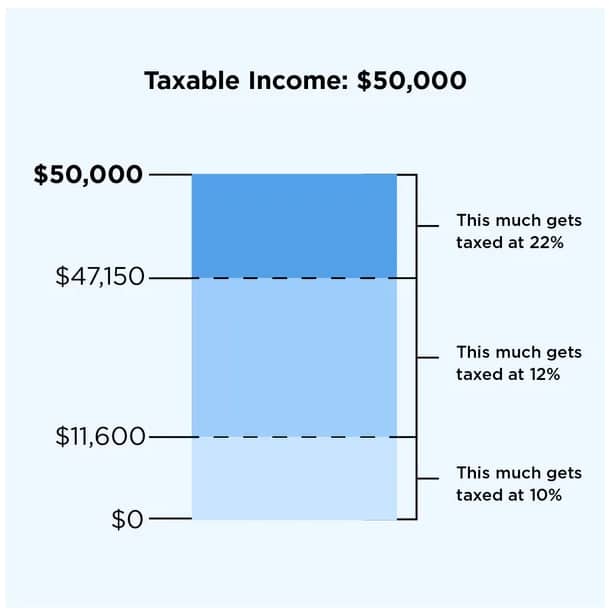 Let’s say you’re a single filer and you had $50,000 of taxable income in 2024. Looking at the chart above, that would put you in the 22% tax bracket. But you don’t pay 22% on the entire $50,000. You would pay 10% on the first $11,600, 12% on the chunk of income between $11,601 and $47,150, and then 22% on the rest. Here’s a visual:
