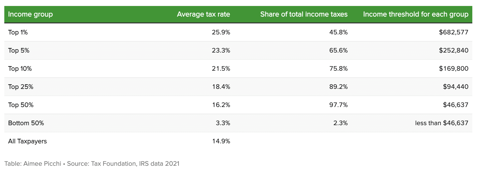 The average taxpayer in America pays around $14,300 in federal income taxes, with an average tax rate of about 15%. But it’s the top 25% of earners that pay 90% of the nation’s taxes, while the bottom 50% account for only about 2%.