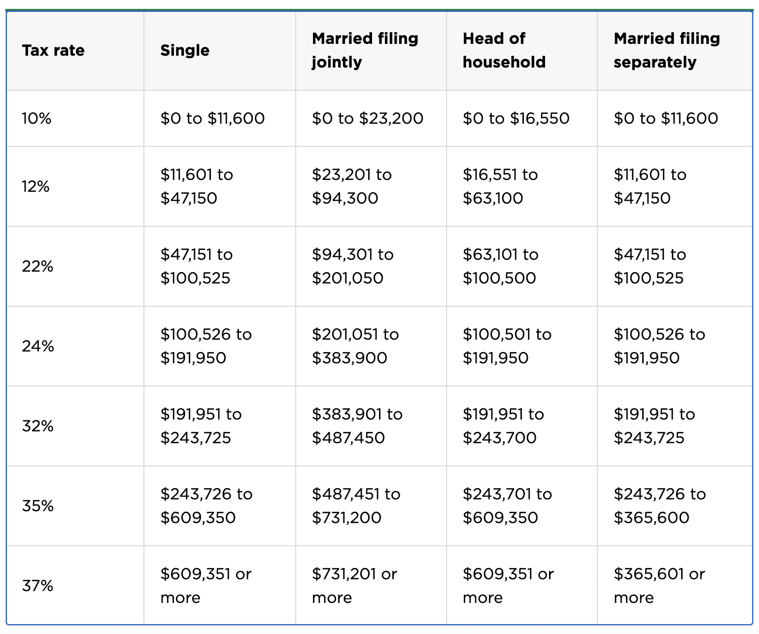 Currently, there are seven tax brackets for ordinary income: 10%, 12%, 22%, 24%, 32%, 35%, and 37%. Here are the 2024 tax brackets (for taxes due in April 2025) and their corresponding income ranges: