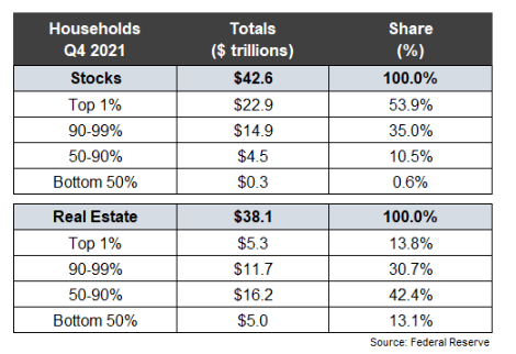 As opposed to the stock market where the top 10% of the population owns 90% of the stocks, the real estate market is far less concentrated with the bottom 90% of the population owning around 55% of the market:
