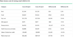 The cost of food and health insurance premiums were the other two categories that took a big leap from 2023 to 2025. The $1,600 decrease in the child tax credit doesn’t help either.