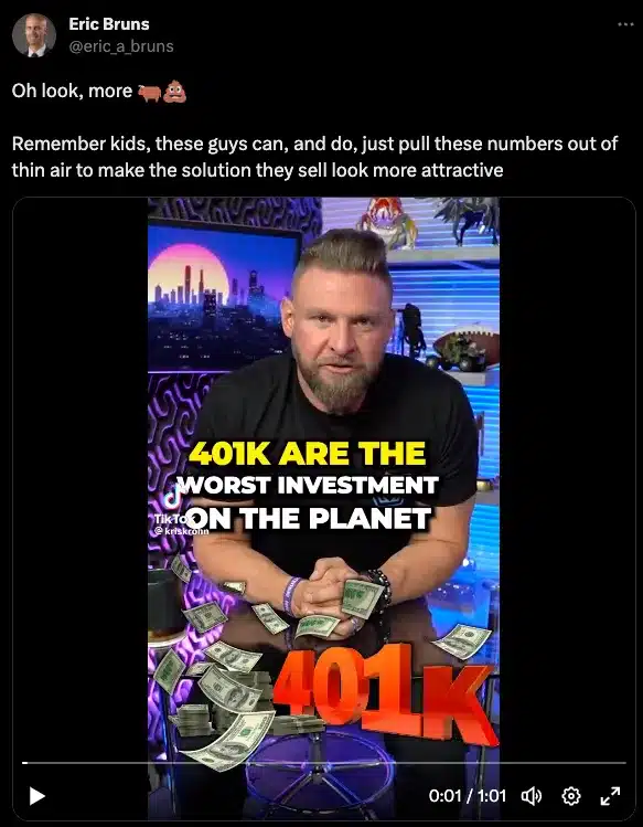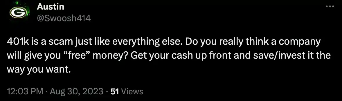 I’ve recently come across some of this “iffy” advice in the form of TikToks and tweets stating 401(k)s are a scam and under no circumstances should you ever put any money into a 401(k).