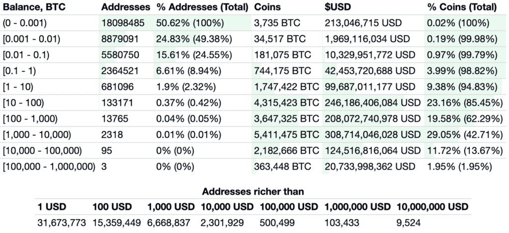 There’s a lot of numbers on this chart, but I want to bring your attention to the fact that of the 57 million people who hold Bitcoin, 47 million have less than $100 worth. Again, I’ll repeat that. About 82% of Bitcoin accounts are under $100 and 94% of accounts are under $1,000.