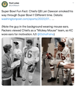 But anyway, this is a professional athlete, halftime of the first Super Bowl ever, smoking a cigarette. I remember seeing this picture and just thinking, “Man, it’s funny how some things just come to be… that was fine.”