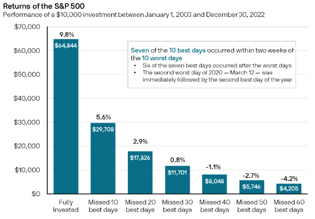 During a 20-year timeframe, there are about 5,060 trading days. If you missed out on only 40 of the best-performing days you would have received a negative total return over that span. You can go from multiplying your money by six to having much less than you started with by just missing 40 days out of 5,060.