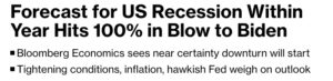 The first line of the article reads, “A US recession is effectively certain in the next 12 months in new Bloomberg Economics model projections.”