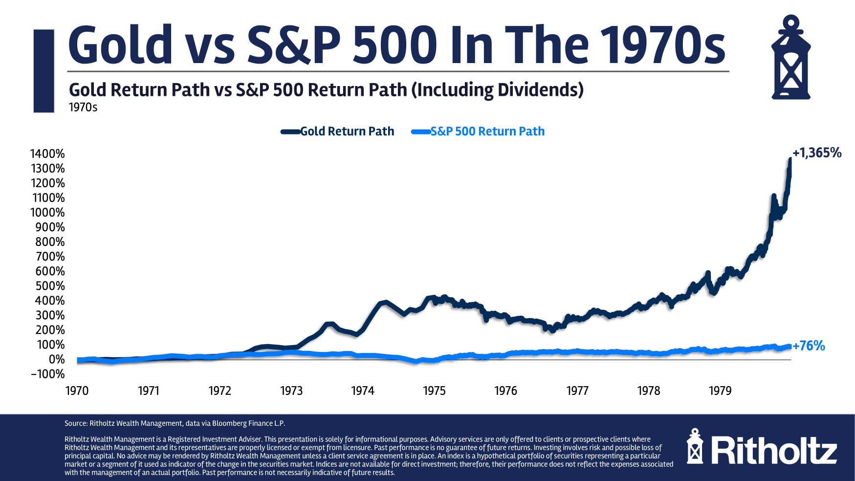 Well, that’s up to you. But if we look back a little further than just the past five years, we’ll find a different story. Here’s a chart from Ben Carlson comparing gold and the S&P 500 during the 80s and 90s: