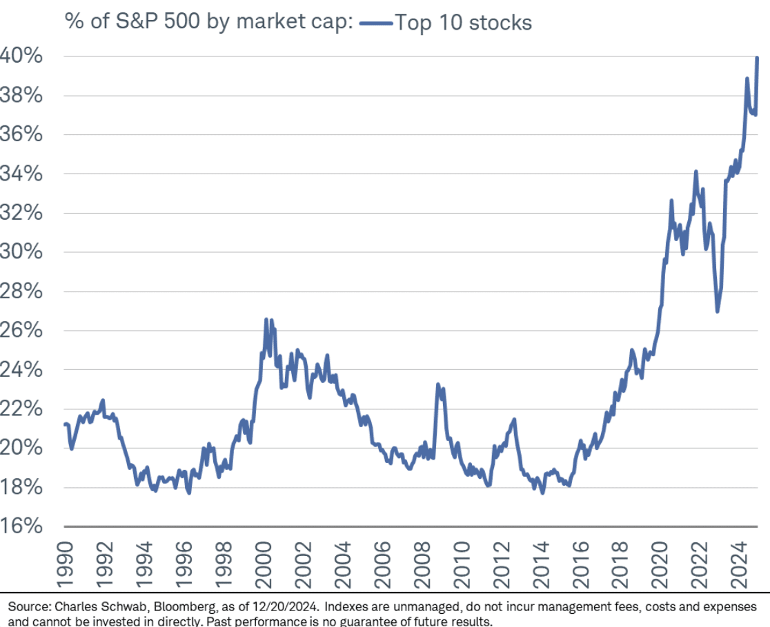 The 10 largest stocks in the S&P 500 now represent nearly 40% of the index: